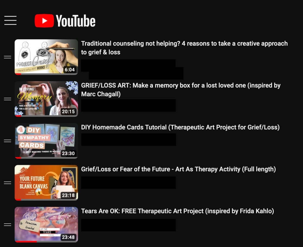 My YouTube channel contains an extensive list of therapeutic art videos on a variety of topics. Break out your art supplies and let me lead you from the comfort of home.